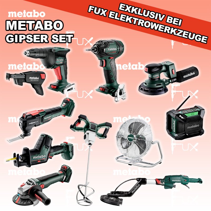 Zu "Gipser Set" von Metabo FUX SPECIAL EXKLUSIV BEI FUX Metabo Gipser Set 8 SOLO Bestell- und Artikelnummer: Gipser Set 8 SOLO FULL Service: 36 Monate zum Nulltarif für Sie! Weitere Infos zum FULL Service BS 18 L BL Q Akku-BohrschrauberAkkuspannung 18 V Drehzahl 0 - 500 / 0 - 1700 /min Drehmoment hart / weich 60 / 28 Nm Gewicht (mit Akkupack) 1.3 kgInfos TBS 18 LTX BL 5000 Akku-TrockenbauschrauberAkkuspannung 18 V Leerlaufdrehzahl 0 - 5.000 /min Max. Drehmoment weich 6 Nm Gewicht mit Akkupack 1,3 kgInfos RW 18 LTX BL 140-2 Akku-RührwerkAkkuspannung 18 V Max. Rührkorb-Durchmesser 140 mm Max. empfohlene Mischmenge 50 l Werkzeugaufnahme Innengewinde M 14 Infos SSD 18 LTX 200 BL Akku-Schlagschrauber Akkuspannung 18 V Anziehdrehmoment 200 Nm Werkzeugaufnahme 1/4" Gewicht 1.3 kgInfos WVB 18 LT BL 11-125 Quick Akku-WinkelschleiferAkkuspannung 18 V Drehzahl 2.800 - 10.000 / min Ø 125 mm Scheiben Gewicht (mit Akkupack) 2.5 kgInfos R 12-18 DAB+ BT Akku-BaustellenradioDAB+ Akkuspannung 12 V / 18 V Extreme Akkupacks mit 14,4 und 18 Volt Gewicht 1.85 kgInfos SSE 18 LTX BL Compact Akku-SäbelsägeAkkuspannung 18 V Hubzahl 0-3000 min-1 Hublängen 16 mm Gewicht (mit Akkupack) 1.8 kgInfos MT 18 LTX BL QSL Akku-Multitool Akkuspannung 18 V Schwingzahl bei Leerlauf 8.000 - 20.000 /min Schleifplatte, Maß Eck zu Eck 93 mm Gewicht 1.7 kgInfos AV 18 Akku-VentilatorAkkuspannung 18 V Max. Luftgeschwindigkeit 3,8 m/s Flügeldurchmesser 355 mm Gewicht (mit Akkupack) 1,2 kgInfos LSV 5-225 Comfort LanghalsschleiferLeistungsaufnahme 500 Watt Durchmesser Schleifteller 225 mm Leerlaufdrehzahl 1000 - 1650 min-1 Gewicht 4.5 kgInfos Schrauber-Magazin Speed Fix 57Robustes Schrauber-Magazin geeignet für TBS 18 LTX 5000 und HBS 18 LTX 3000Infos Ergattere dir einen Akku bei der Registration auf metabo.ch Alle Produkte dieser Aktion anzeigen OHNE AKKUS UND LADEGERÄT Standard-Ausrüstung In diesem Set enthalten: BS 18 L BL Q Akku-Bohrschrauber TBS 18 LTX BL 5000 Akku-Trockenbauschrauber RW 18 LTX BL 140-2 Akku-Rührwerk SSD 18 LTX 200 BL Akku-Schlagschrauber WVB 18 LT BL 11-125 Quick Akku-Winkelschleifer R 12-18 DAB+ BT Akku-Baustellenradio SSE 18 LTX BL Compact Akku-Säbelsäge MT 18 LTX BL QSL Akku-Multitool AV 18 Akku-Ventilator LSV 5-225 Comfort Langhalsschleifer Schrauber-Magazin Speed Fix 57 Listenpreis CHF 3'401.50 Fuxpreis CHF 2'316.00 inklusive 8.1% MwSt Frankolieferung Kein Grauimport! Produkt bestellen 1 Stück 2 Stück 3 Stück 4 Stück 5 Stück 6 Stück 7 Stück 8 Stück 9 Stück 10 Stück Alle Angaben ohne Gewähr und solange Vorrat reicht!Wiederverkäufer werden? Produkt als PDF NEUHEITAKTION 31%